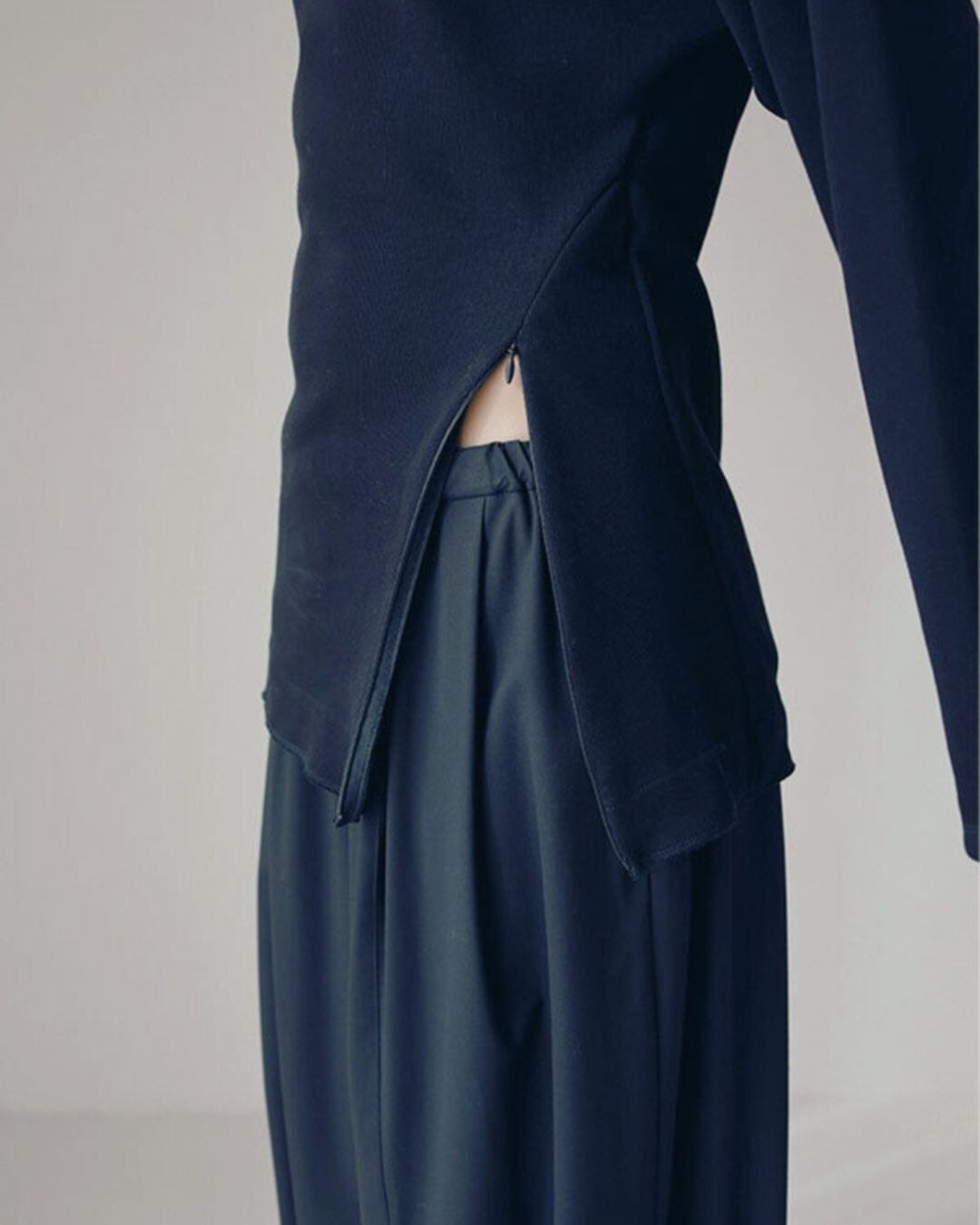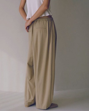 センターピンタックと後ろ裾の切り替えにより、落ち感のある美しいシルエットをキープ。ウエスト部分には華奢なゴムを使用し、抜け感とストレスフリーな着心地を実現しました。ワンランク上のモードライクなスタイリングを楽しめる、上質な一着です。