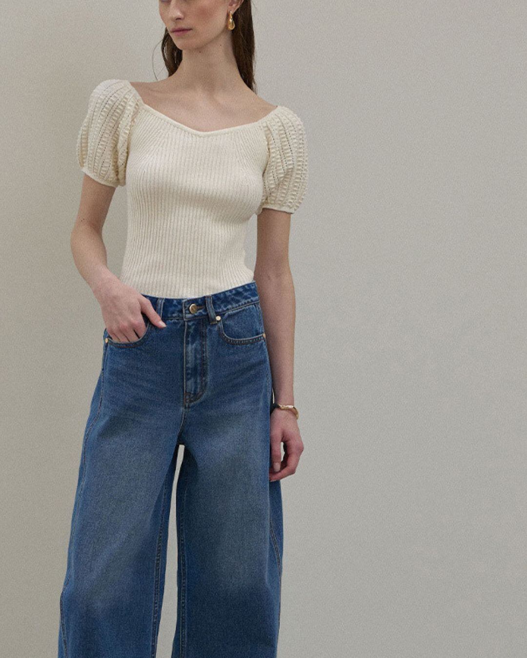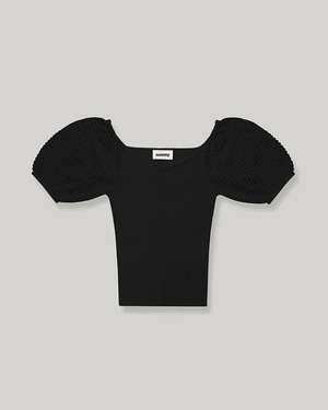 少し太めのリブと、袖には凹凸感のある編地を取り入れたパフスリーブハートネックニットトップ。衿は着用の仕方で、ボートネックやオフショルダーにもアレンジ可能で、ネックラインはデコルテをすっきりと見せてくれます。袖は編みでパフスリーブデザインに仕上げ、より女性らしさを演出。スカートやパンツなど、さまざまなコーディネートをお楽しみいただけます。