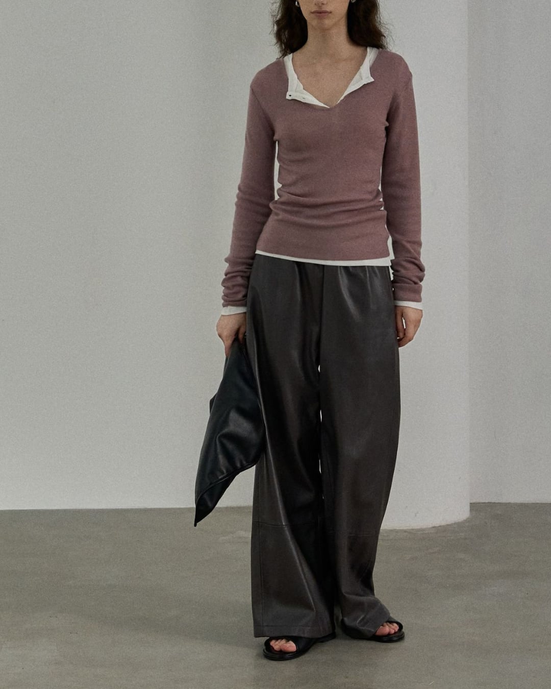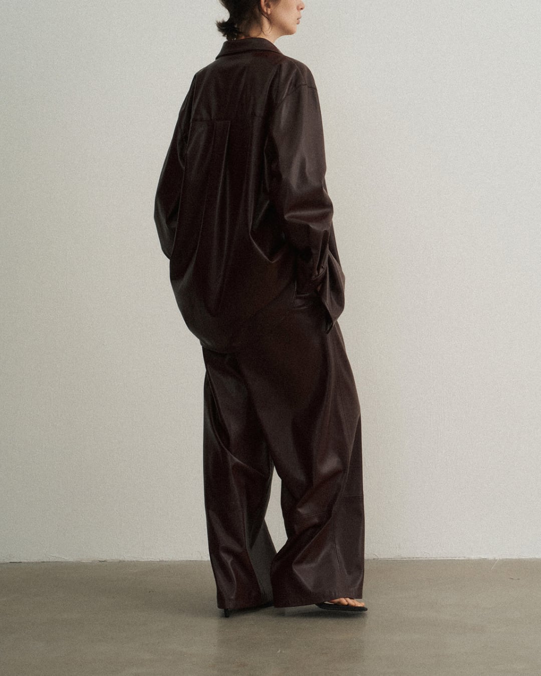 風合いの柔らかさに優れ、天然皮革に近い高級感のある表情が特徴の上質なエコレザーを使用したカービーフィットパンツ。ウエストはリラックス感のあるゴム仕様でサイズ調整が可能。