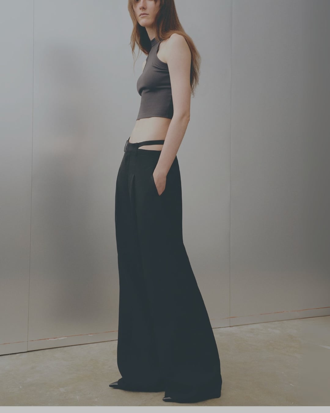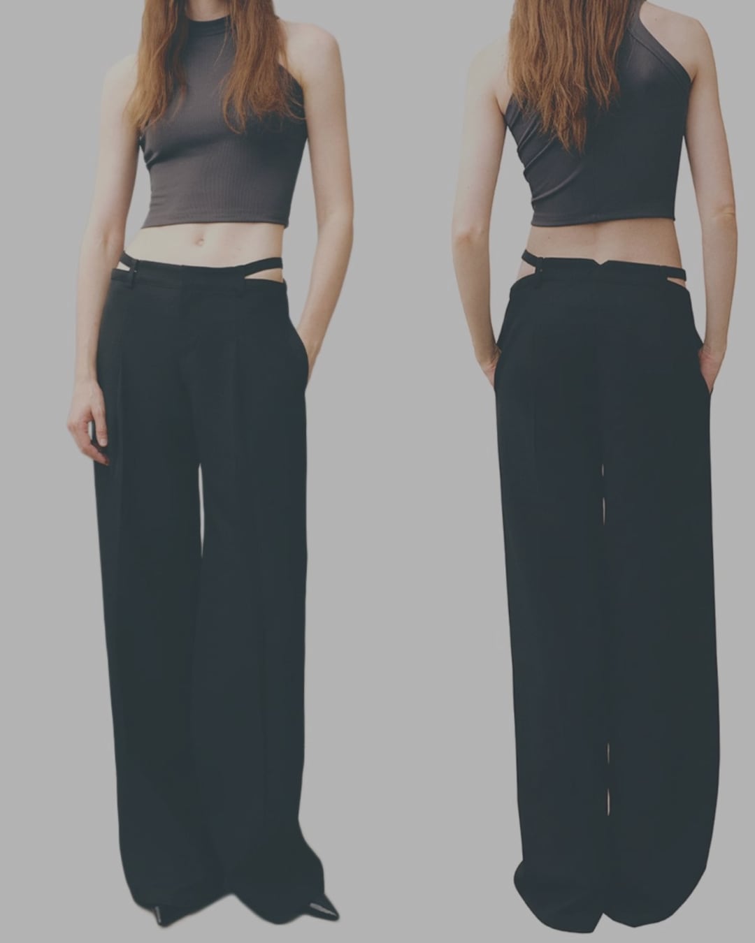 ウエストは細幅のストラップを平行に配した二重構造。両者の間に肌がのぞくスリットが生まれ、レイヤード風のデザインに、二重のラインがウエストを際立たせ、抜け感とモードな肌見せを叶える一着です。