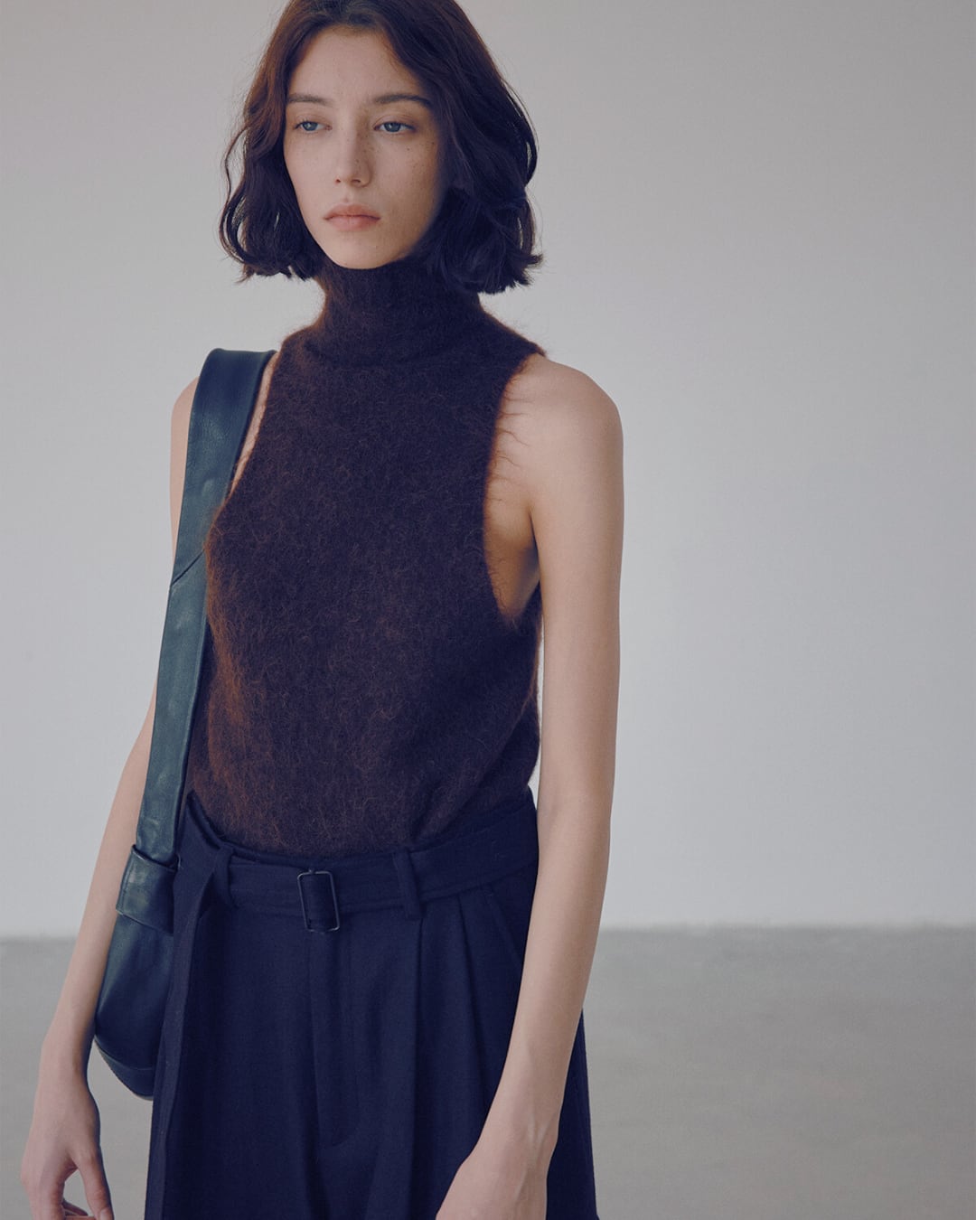 モヘアウールをブレンドした素材で作られたタンクトップ。しっとりとした肌触りと柔らかなストレッチ性を併せ持ち、モヘア特有の風合いが奥行きのある色合いを引き立てます。