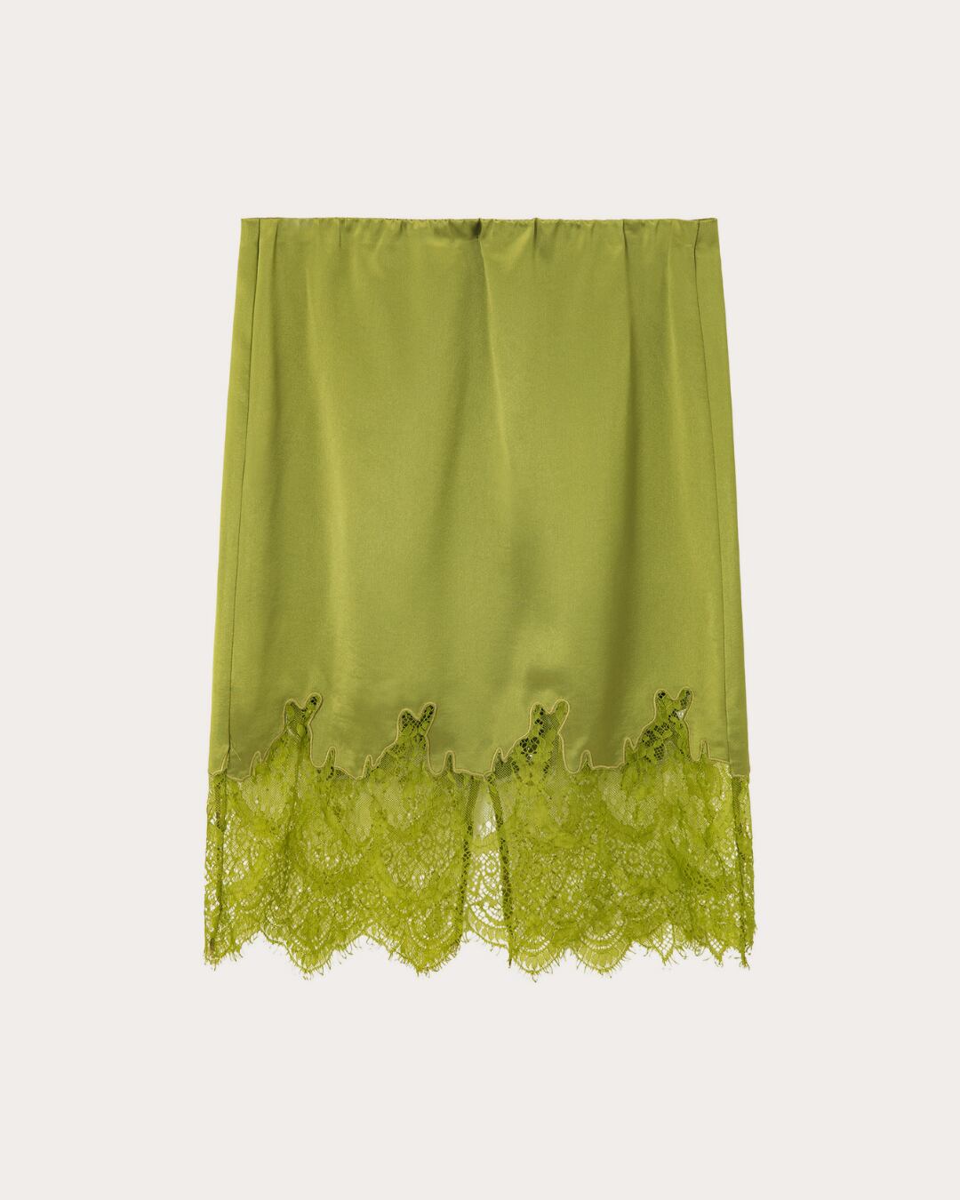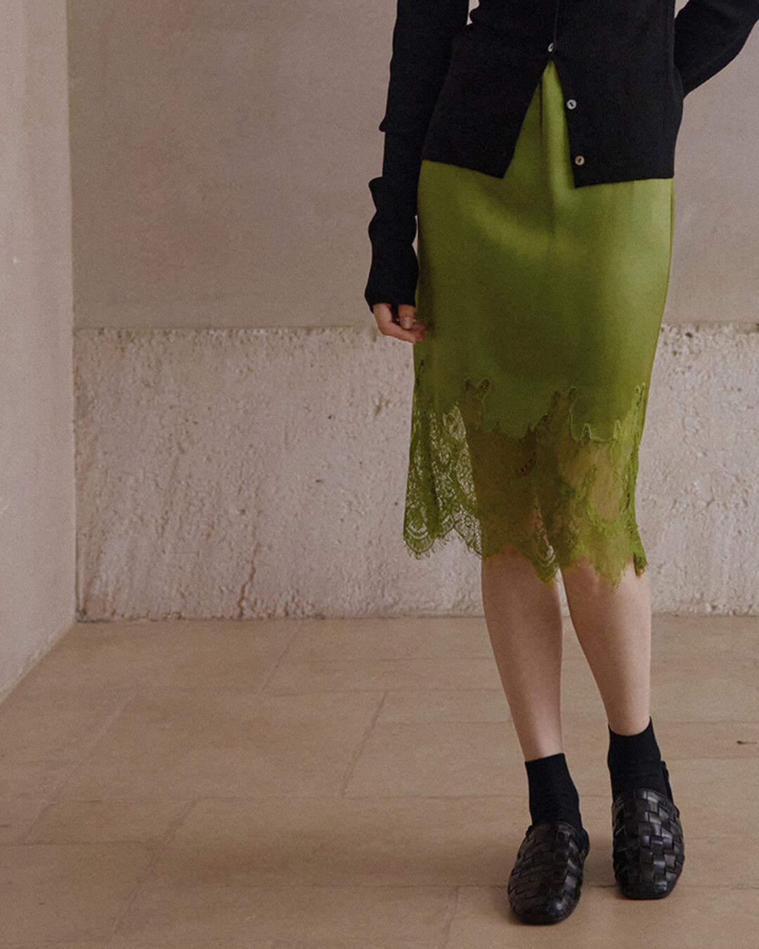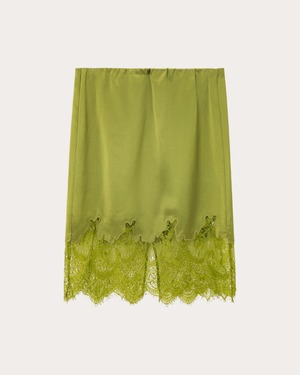 サテンデザインスカート。裾に幅の広いレース生地を使用しランジェリーライクな印象に。 Tシャツを合わせたラフなスタイリングや、秋冬はニットを合わせた温かみのあるスタイリングもおすすめです。