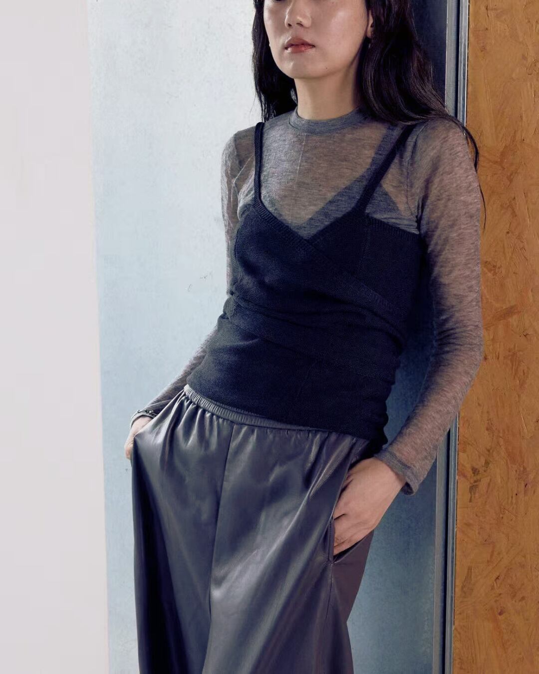 シャツやブラウスとレイヤードして、様々なスタイリングを楽しめます。