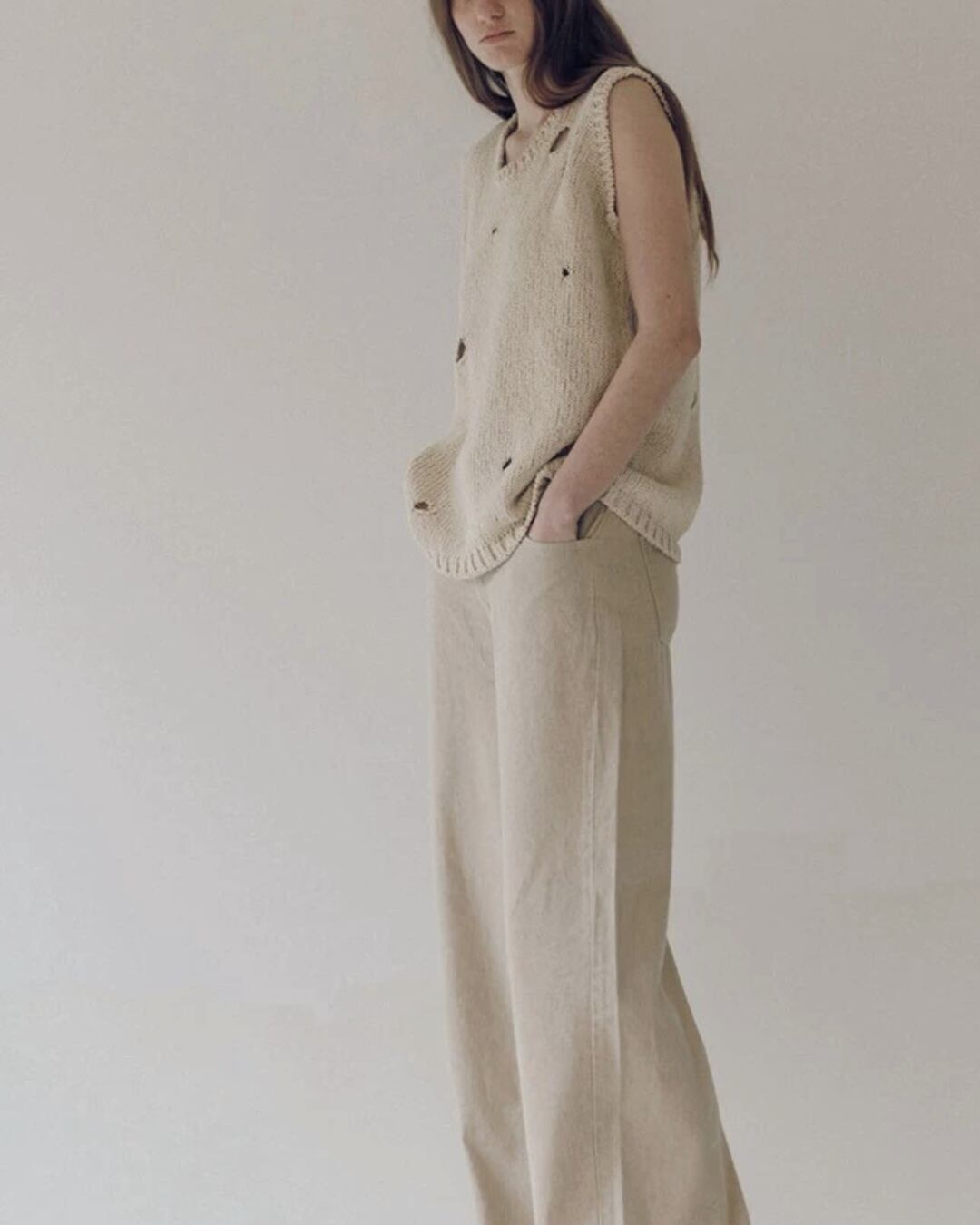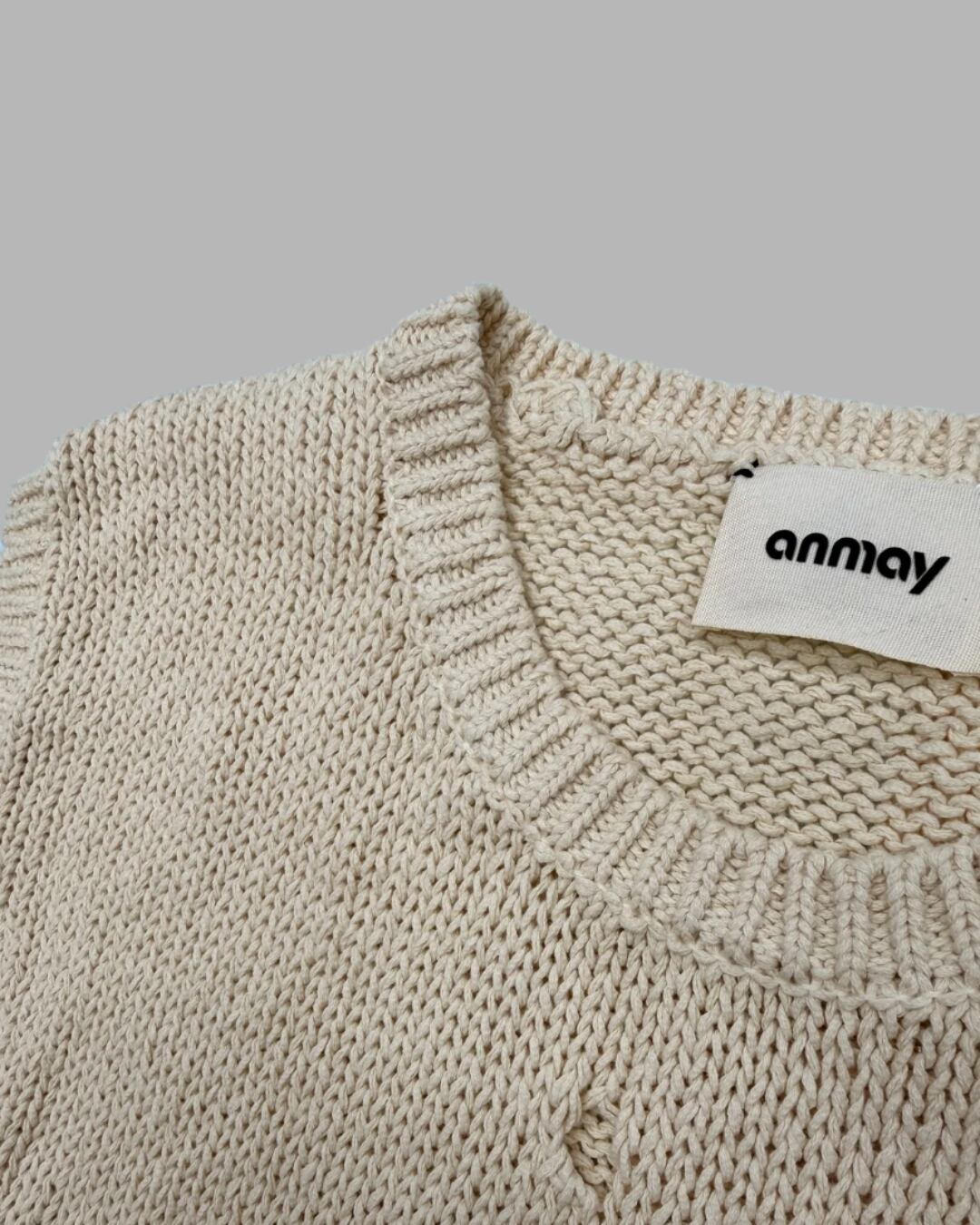 コットン天竺で編み上げたクルーネックニットベスト。程よくリラックスしたビッグシルエットがポイント。