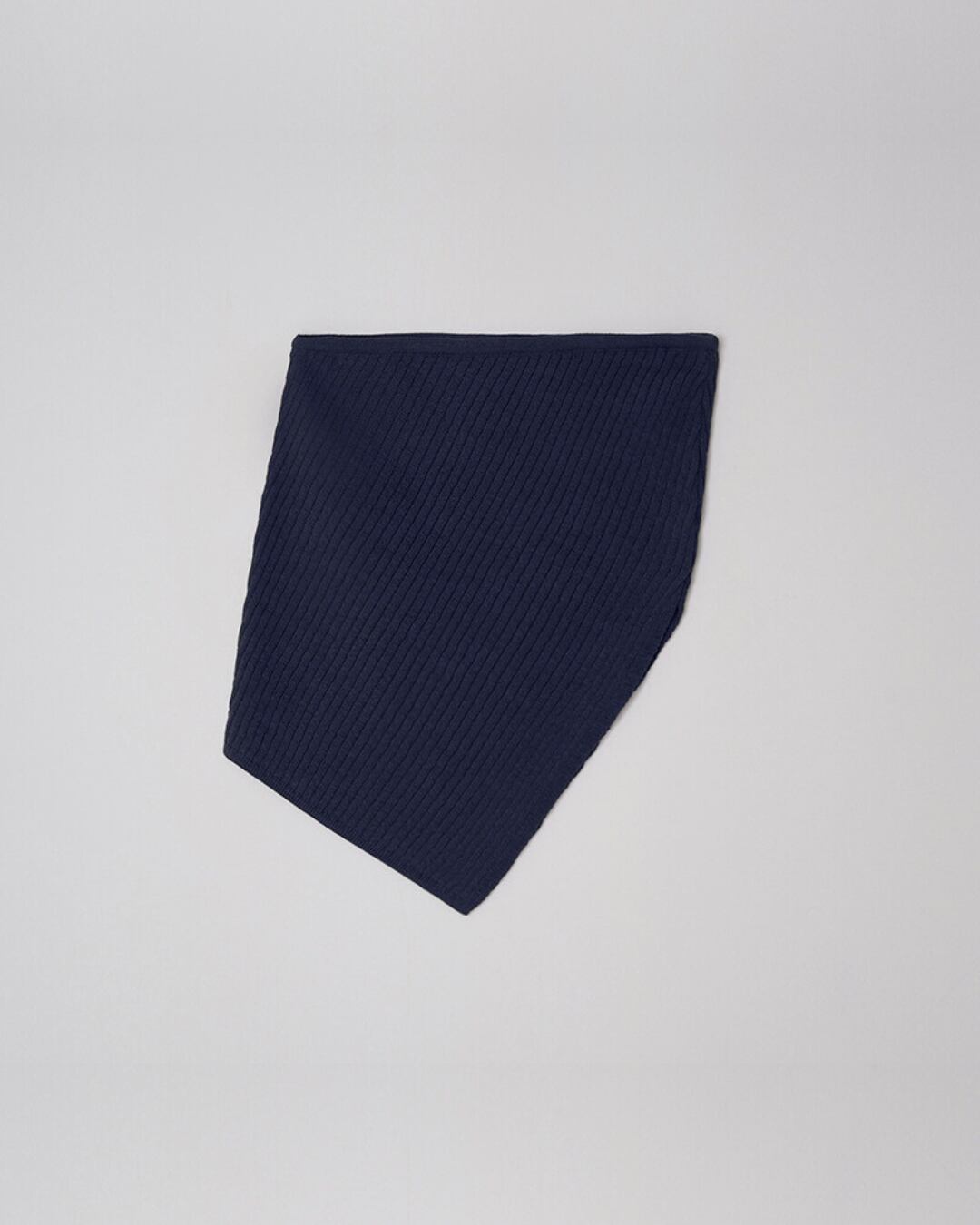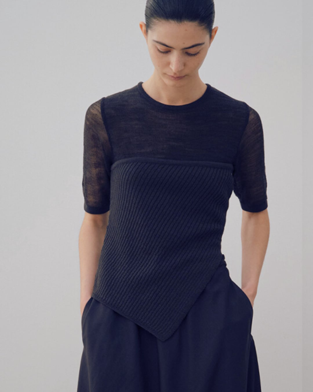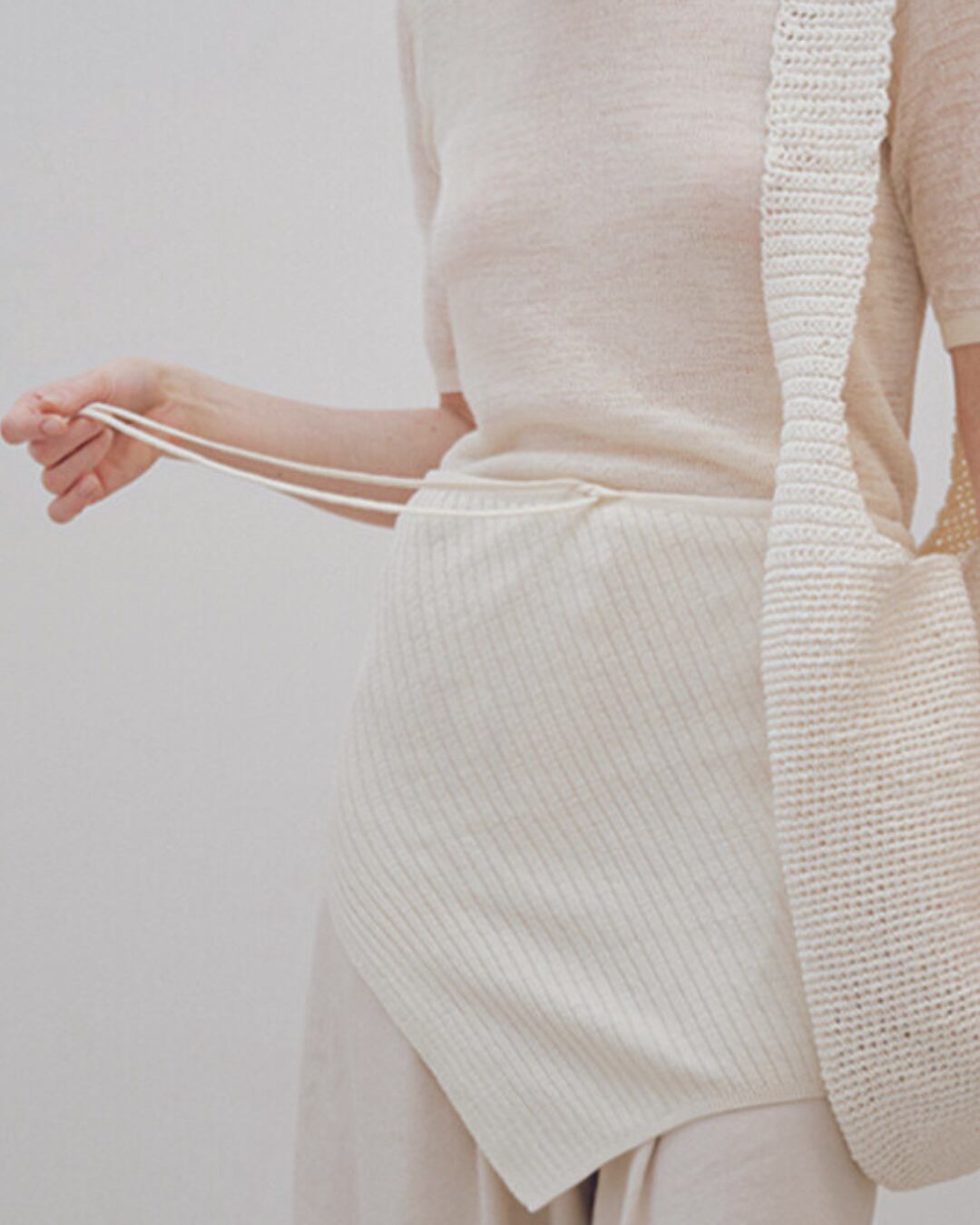 コットンナイロンの混紡糸を使用し、さらりとした肌触りとストレッチの効いたシャリ感を兼ね備えたチューブトップ。立体的なリブ編みの流れを活かし、アシンメトリーな裾に仕立てています。ドローストリングを調整すればスカートにもインナーにもなり、初秋には一枚でトレンド感のあるスタイルが完成です。