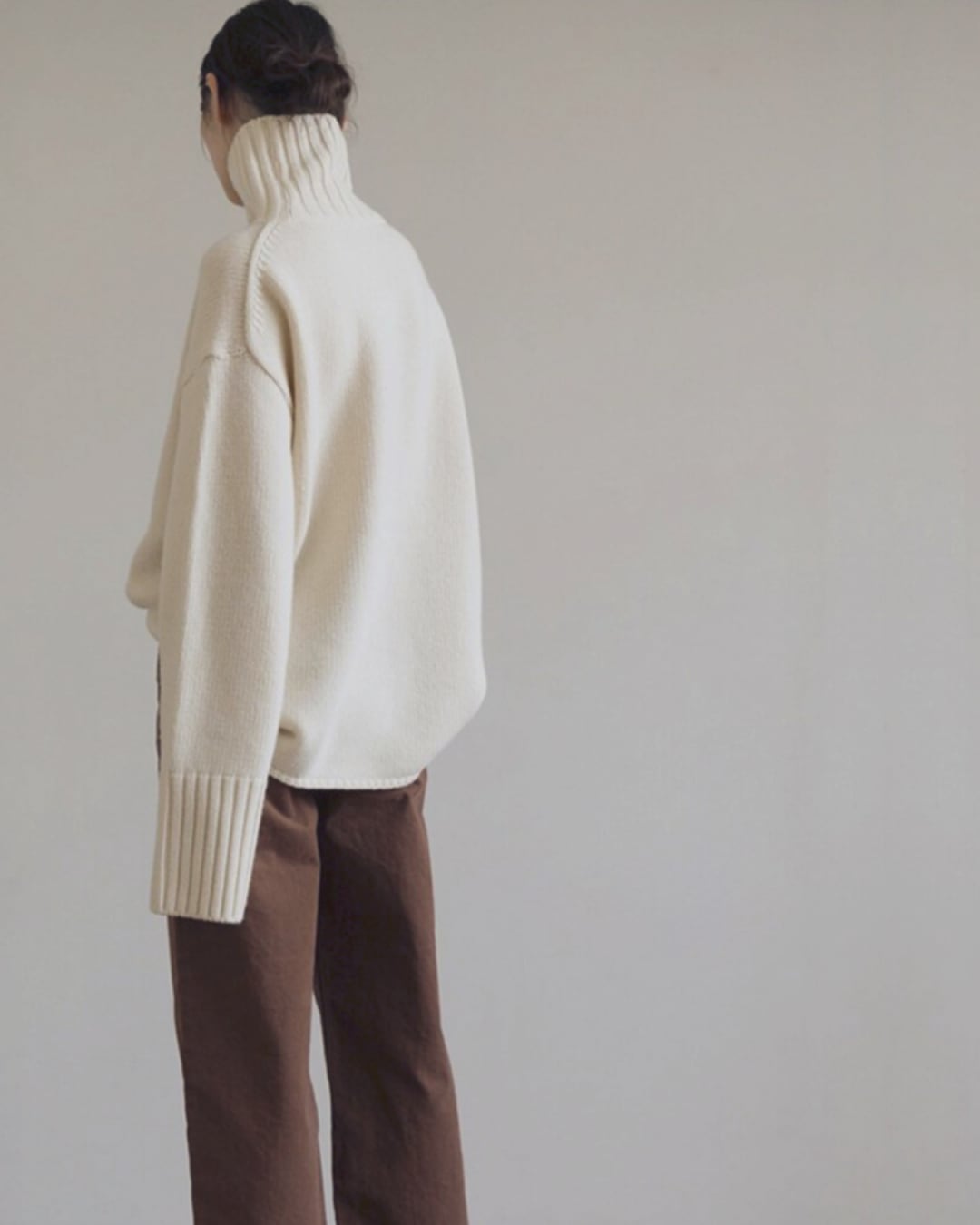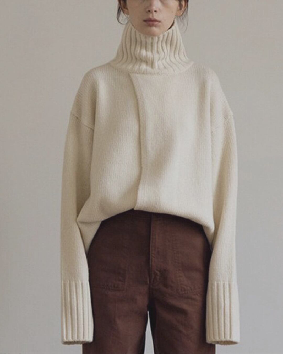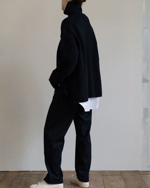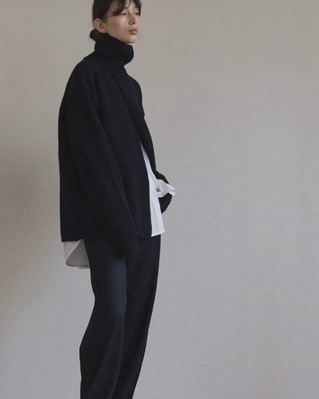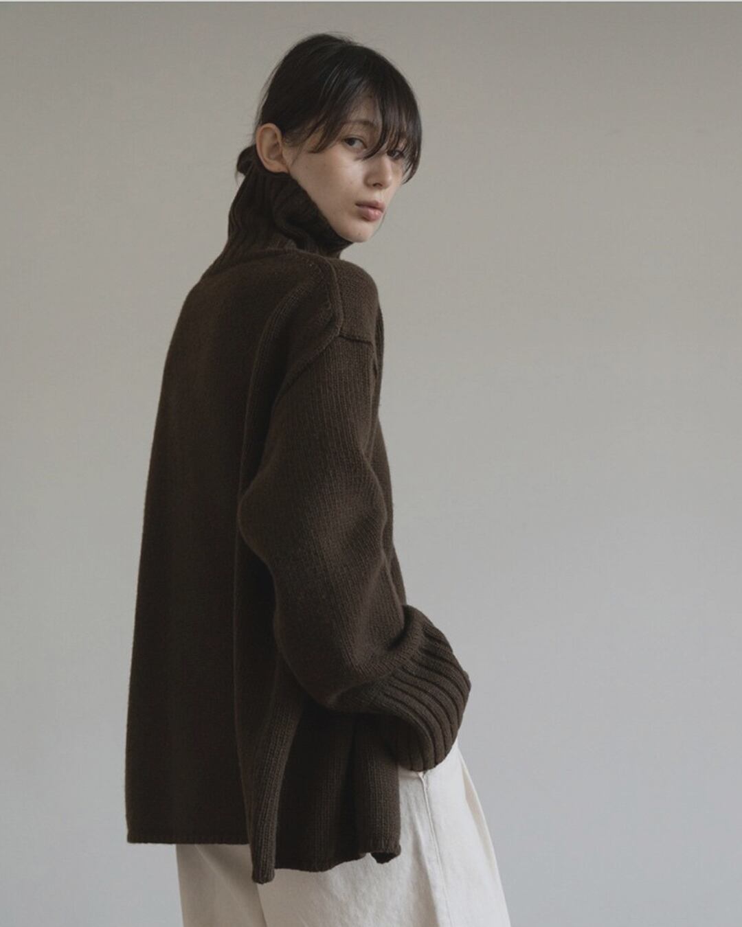 ファンネルネックのニットはリラックスしたフィット感でデザインされており、肩の落ちたシルエットや、スリットを生み出すラップオーバーフロントが特徴です。