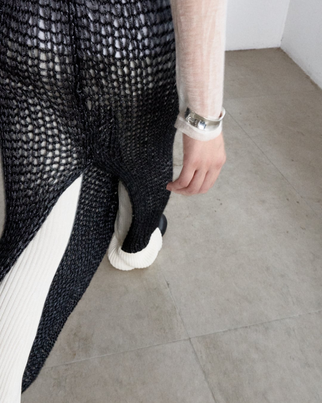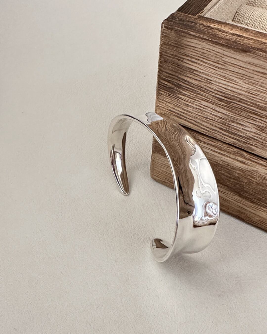 ほどよいボリューム感のウェーブラインが手元を美しく引き立てるくシルバーバングル。