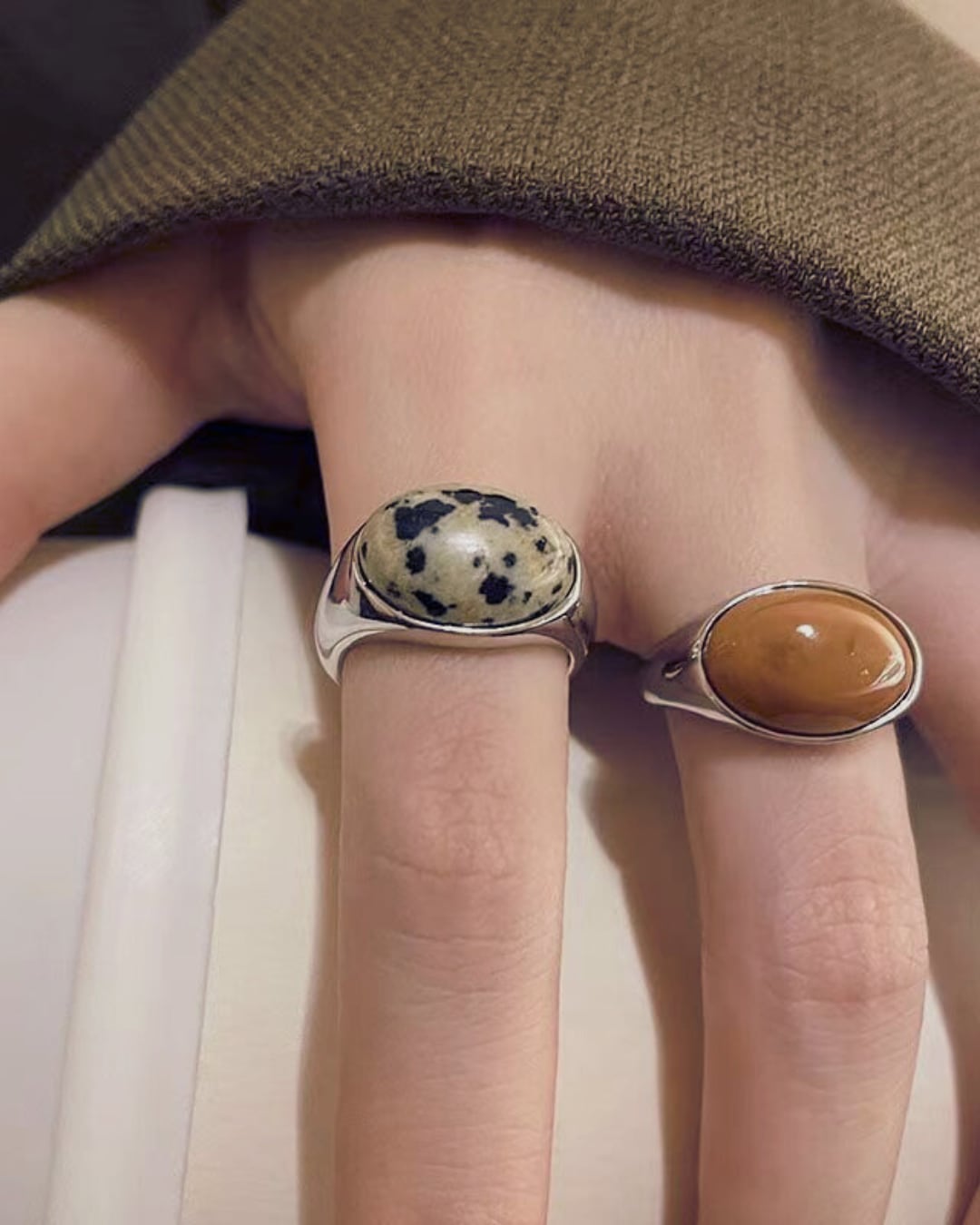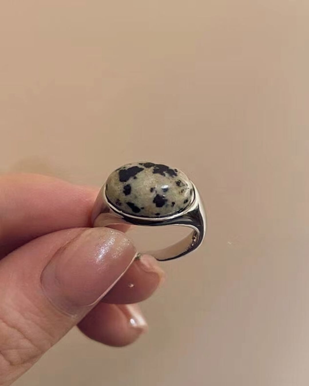 ダルメシアンジャスパー、イエロージェイドを贅沢に使用したリング。シンプルでありながらも存在感のあるデザインで、カジュアルからフォーマルまで幅広いスタイルにマッチします。Silver925素材のため、独自のくすみなど経年変化を楽しんでいただけます。