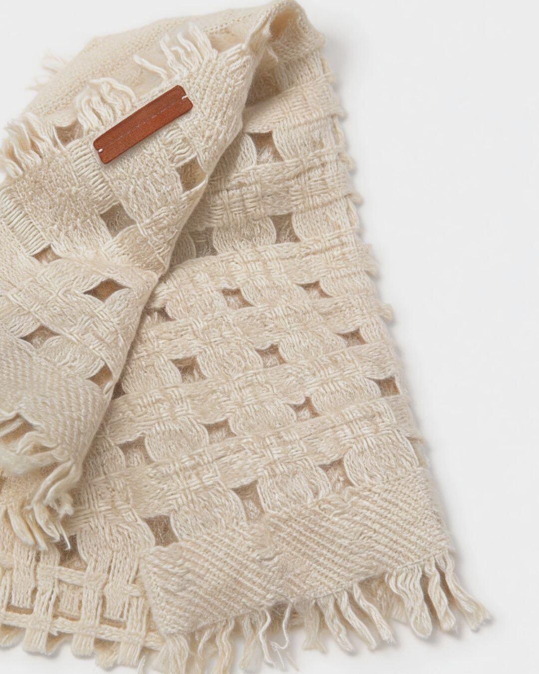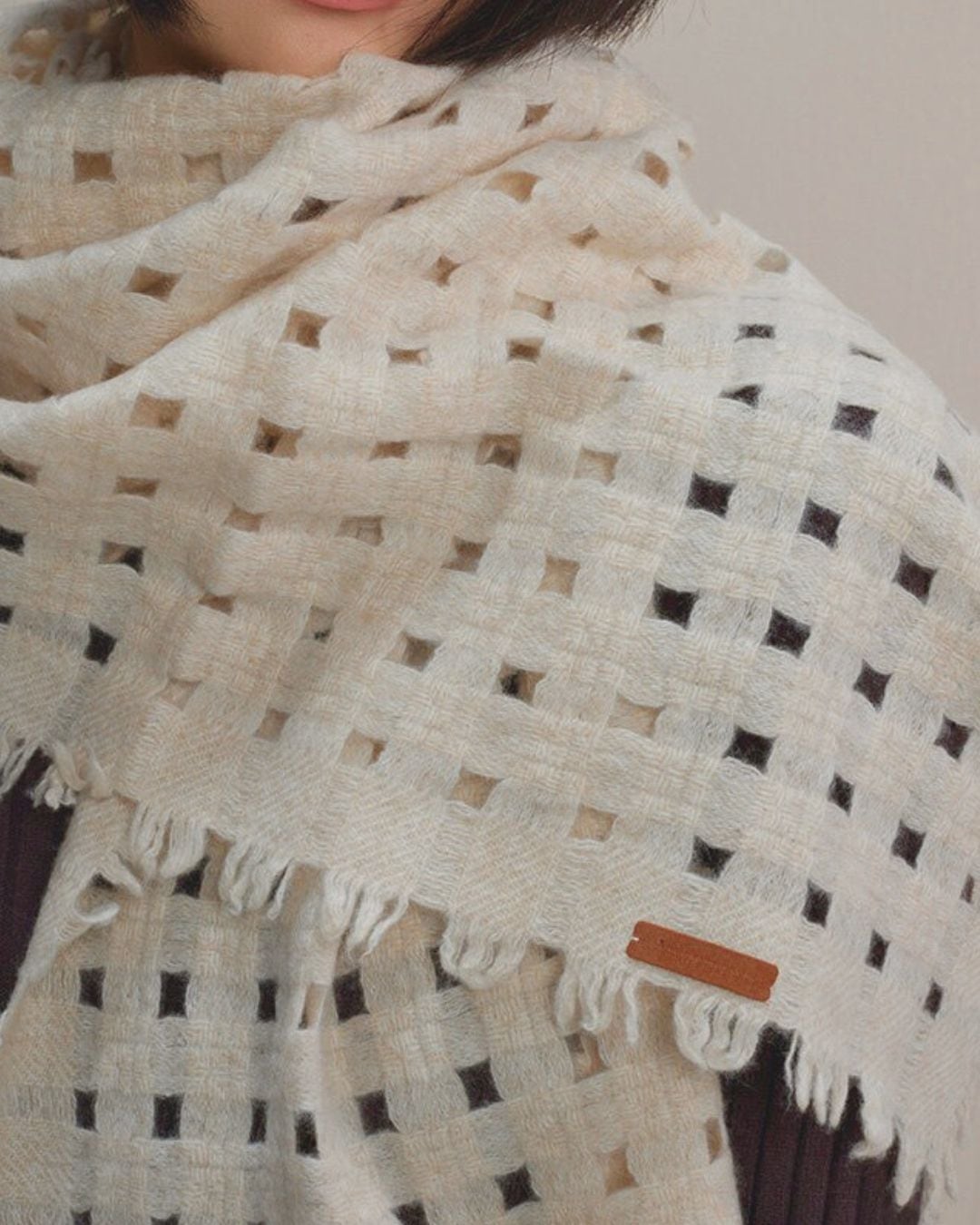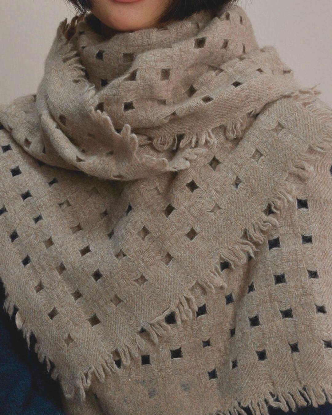 格子状の透かし編みデザインが軽やかな印象を与え、ふんわりと空気を含むような柔らかさが魅力です。