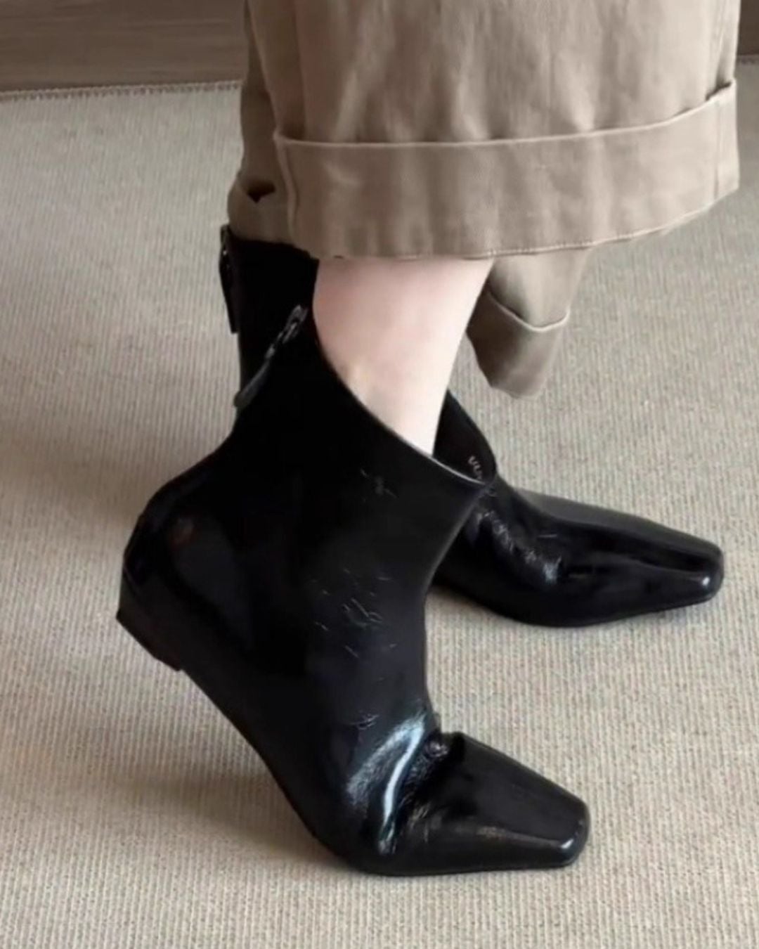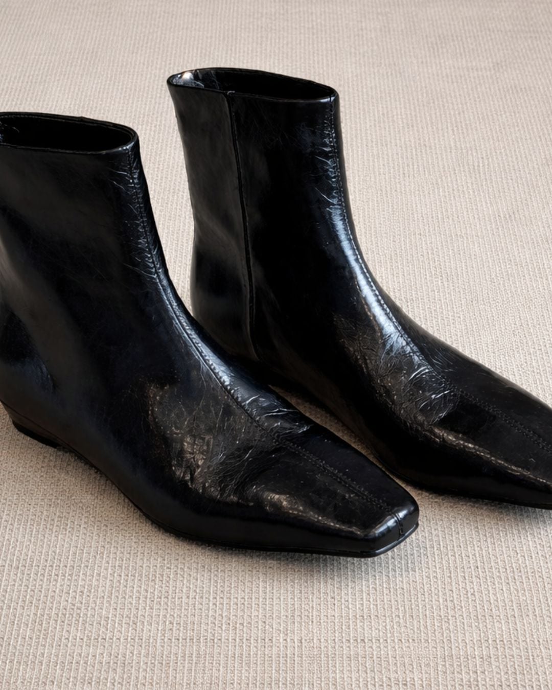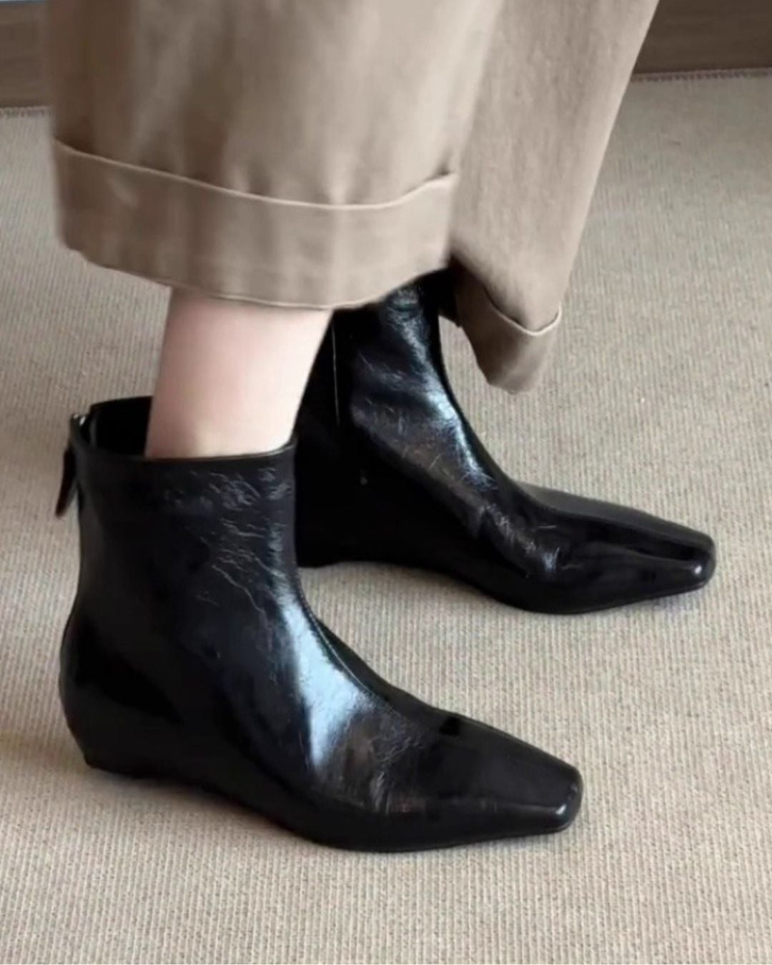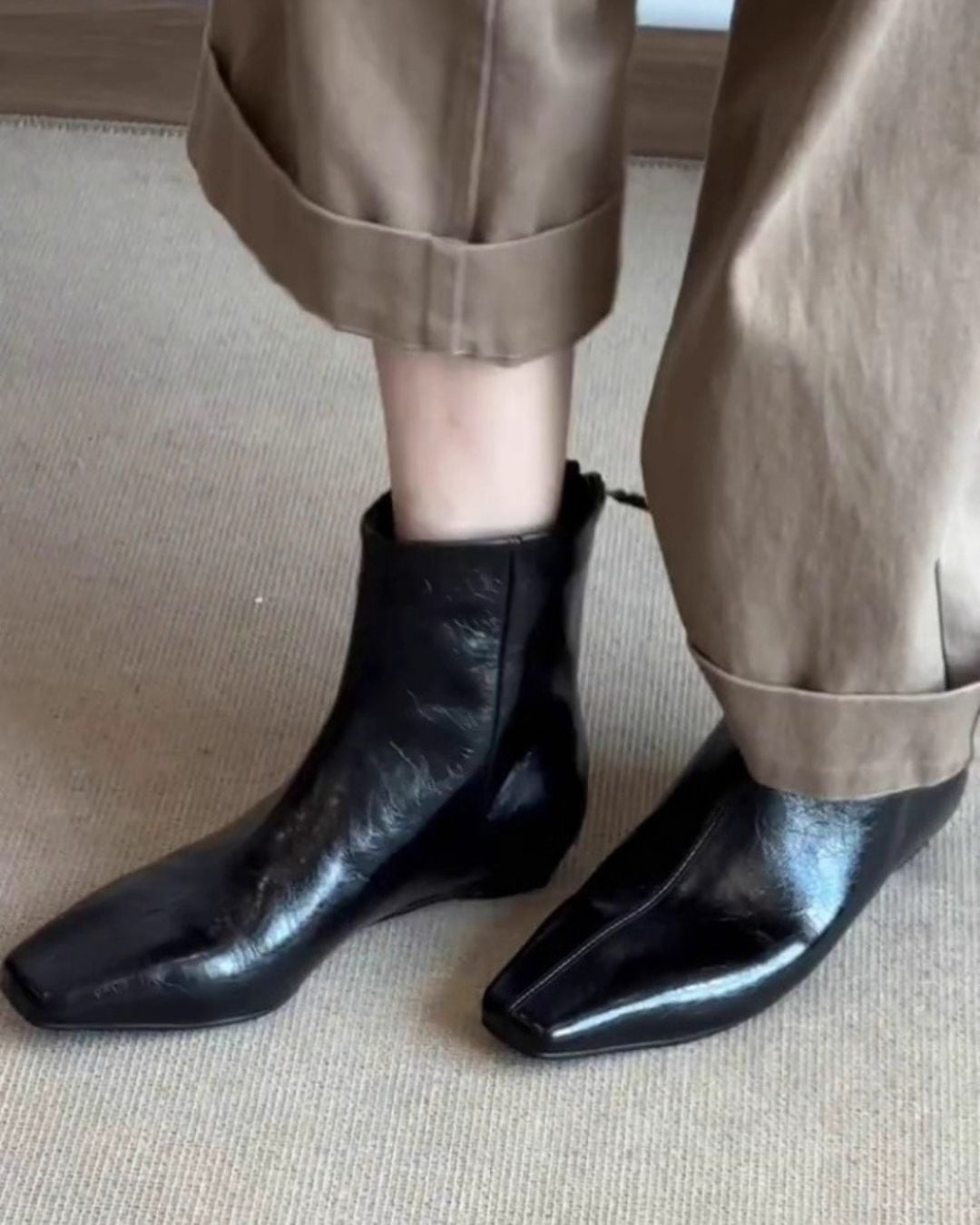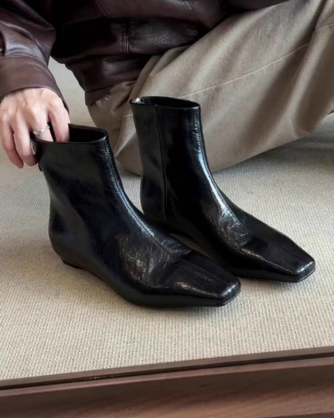 シャープなスクエアトゥが印象的な、ミニマルデザインのショートブーツ。