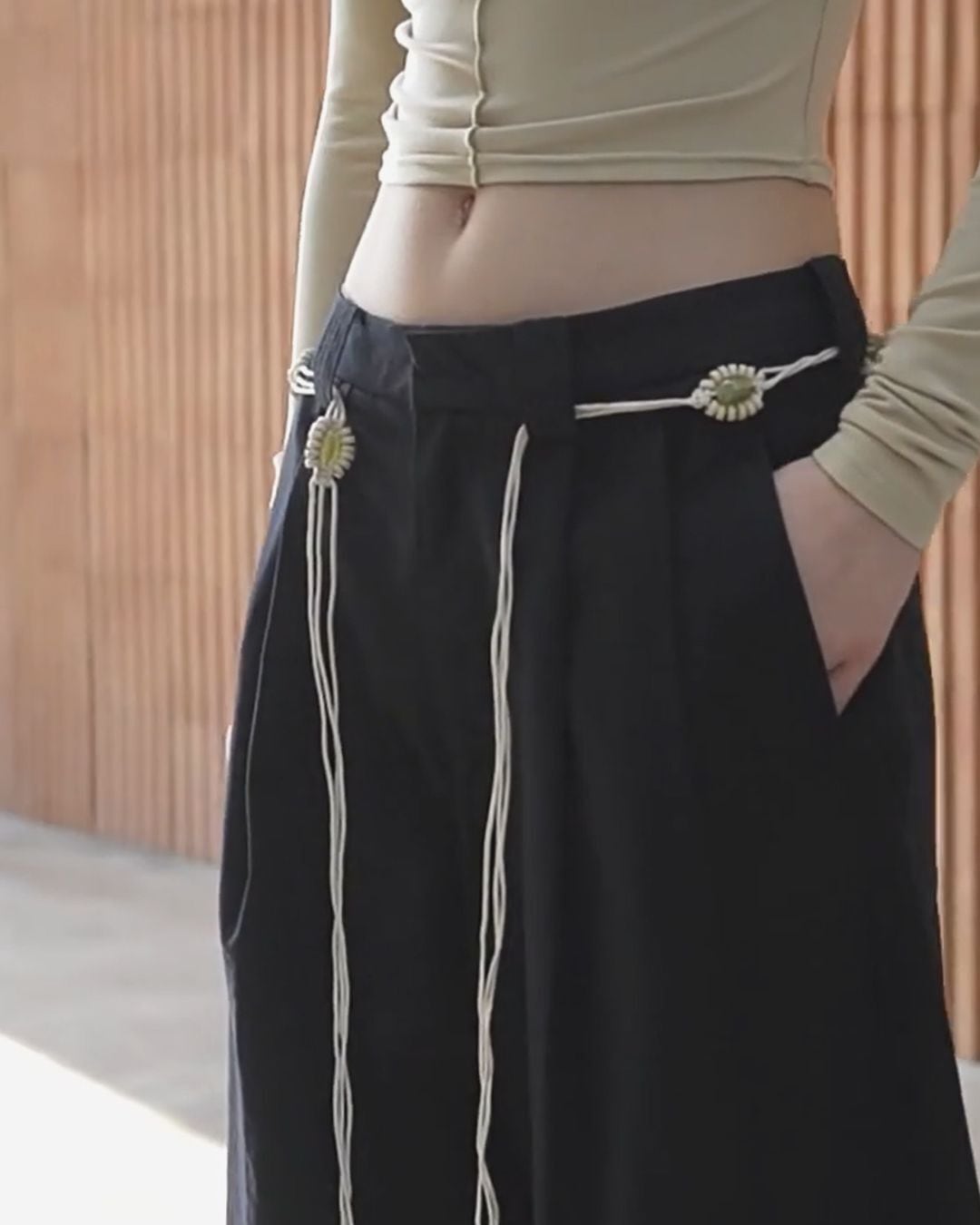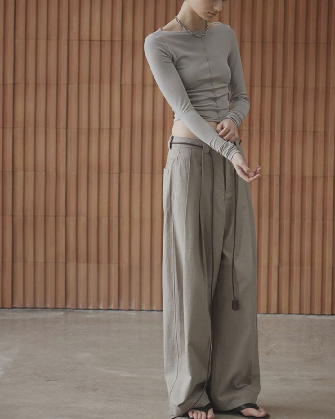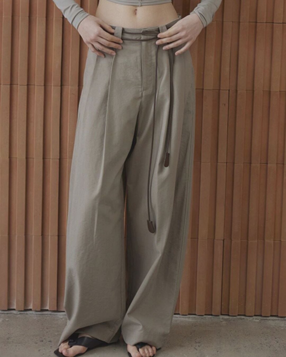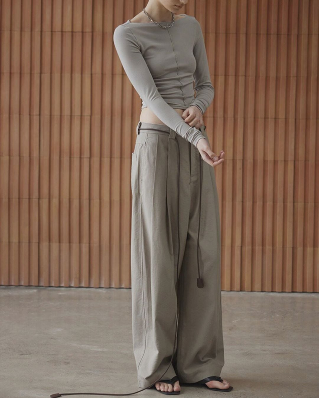 ハイウエスト設計で腰位置を高く見せる、ストレートワイドシルエットのロングパンツ。
