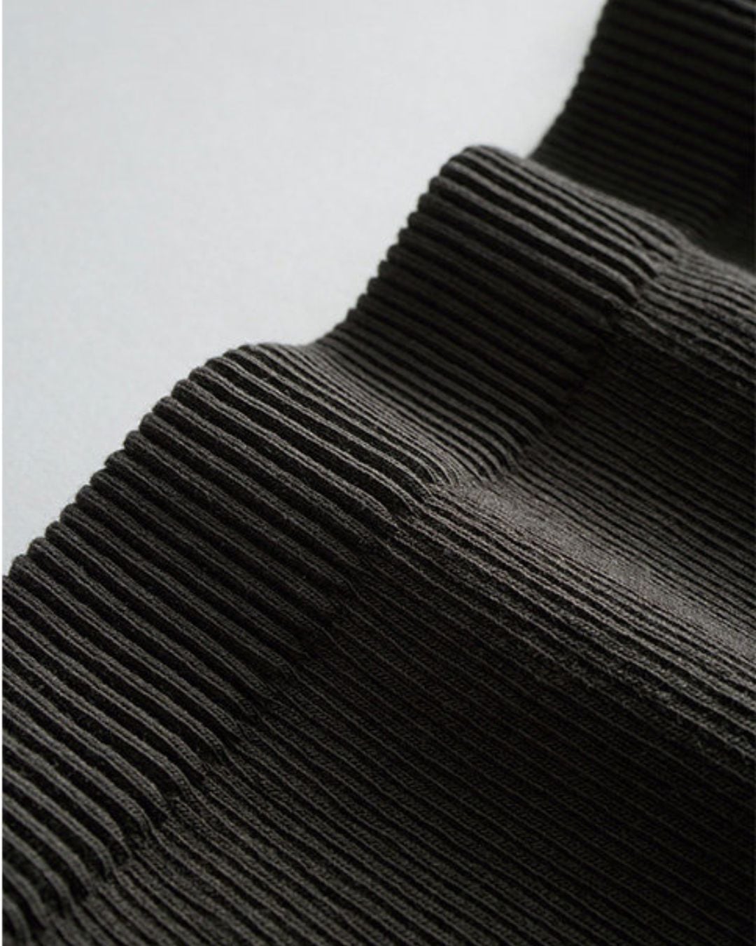伸縮性に優れたリブ編み素材を使用し、身体にやさしくフィットする快適な着心地が特徴です。
