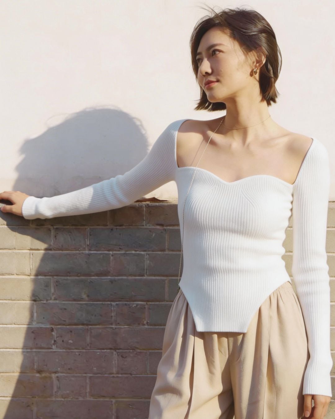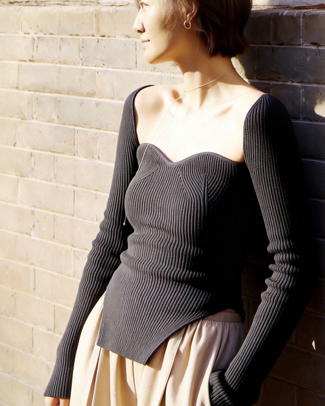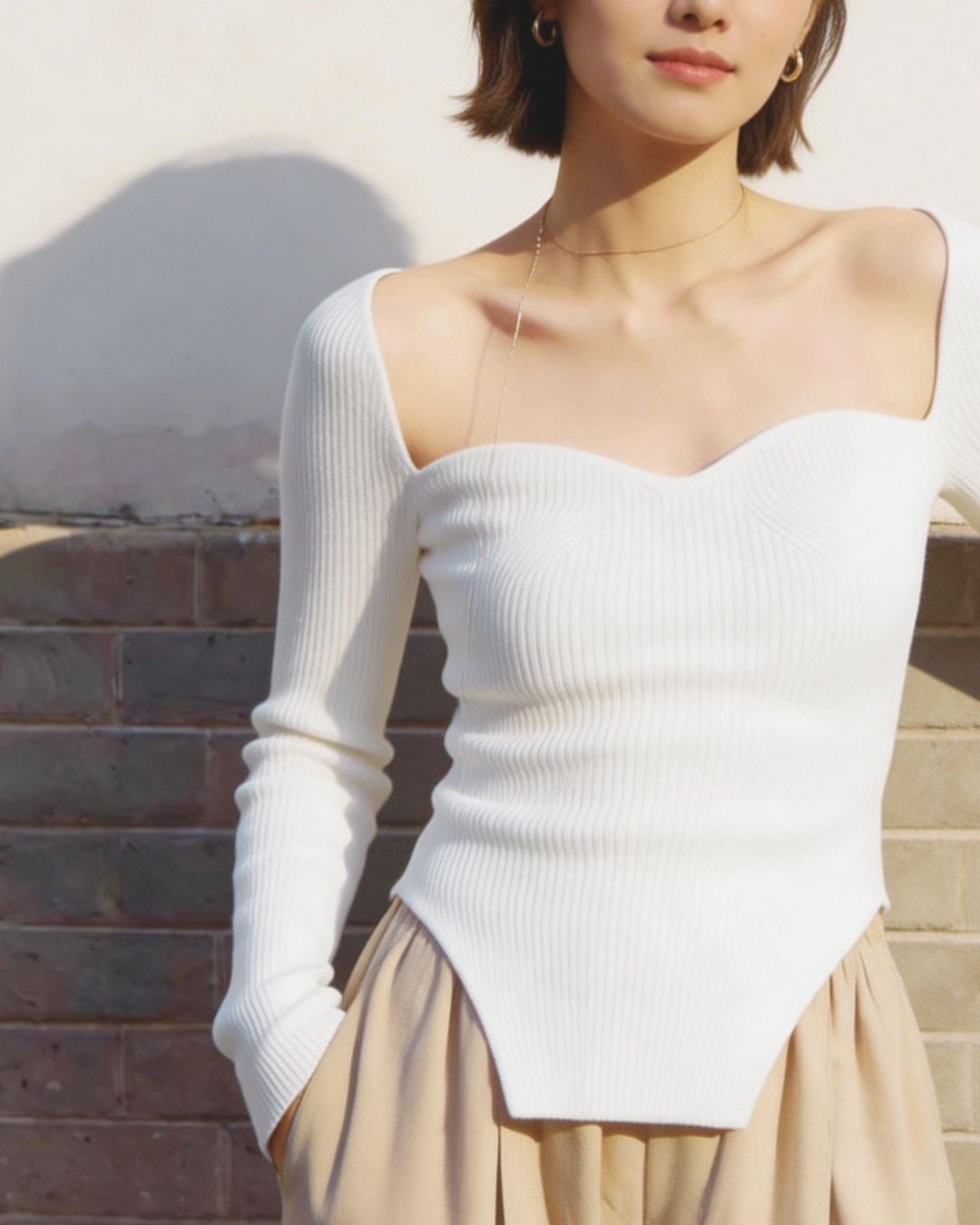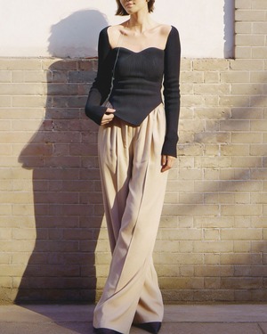デコルテを美しく引き立てるスウィートハートネックが印象的なリブニットトップス。