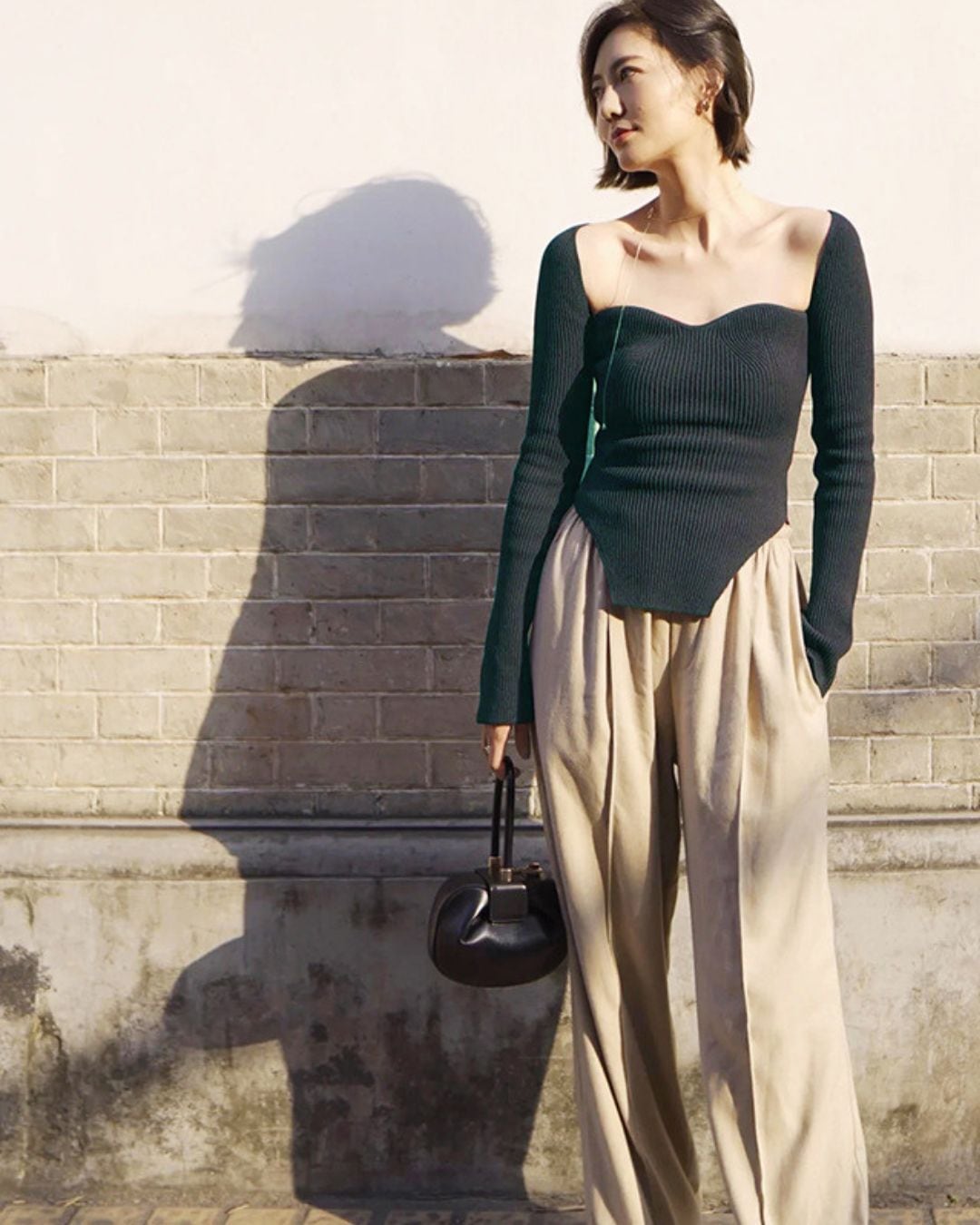 ウエストにかけてシャープにカットされたヘムラインがスタイリングにアクセントを加え、